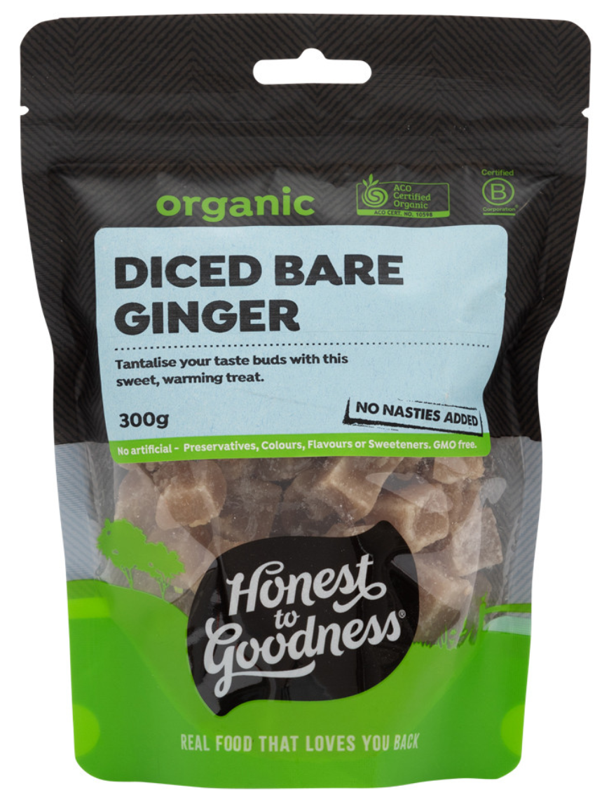 Organic Diced Bare Ginger is made from cooked organic ginger that is simply diced and steeped in cane sugar. Sweet, peppery and warming, this ginger is great baking ingredient, paired with dark chocolate or featured a cheese platter.
