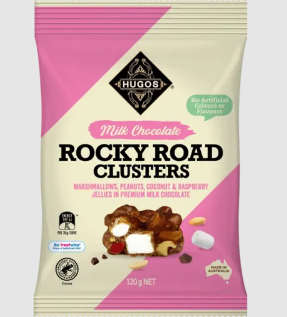 Hugo's Rocky Road Clusters combine premium milk chocolate with marshmallows, peanuts, coconut flakes and raspberry jellies. Each bite delivers a delightful mix of chewy, crunchy and fruity flavors. This 120g pack is perfect for snacking, sharing or treating yourself.