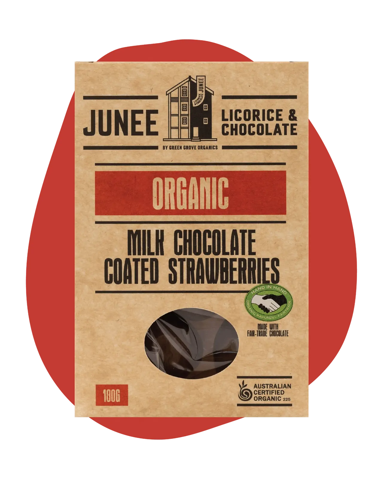 Freeze dried strawberries coated in organic couverture milk chocolate