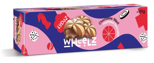 Wheelz is a chocolate lover's dream come true! These delectable biscuits feature a luscious chocolate-filled centre and an eye-catching chocolate marbling pattern on top. Perfect for any occasion, Wheelz Biscuits offer a unique and indulgent treat that will satisfy your chocolate cravings. Whether you're sharing them with friends or enjoying a quiet moment to yourself, Wheelz Biscuits promise a delightful experience with every bite!