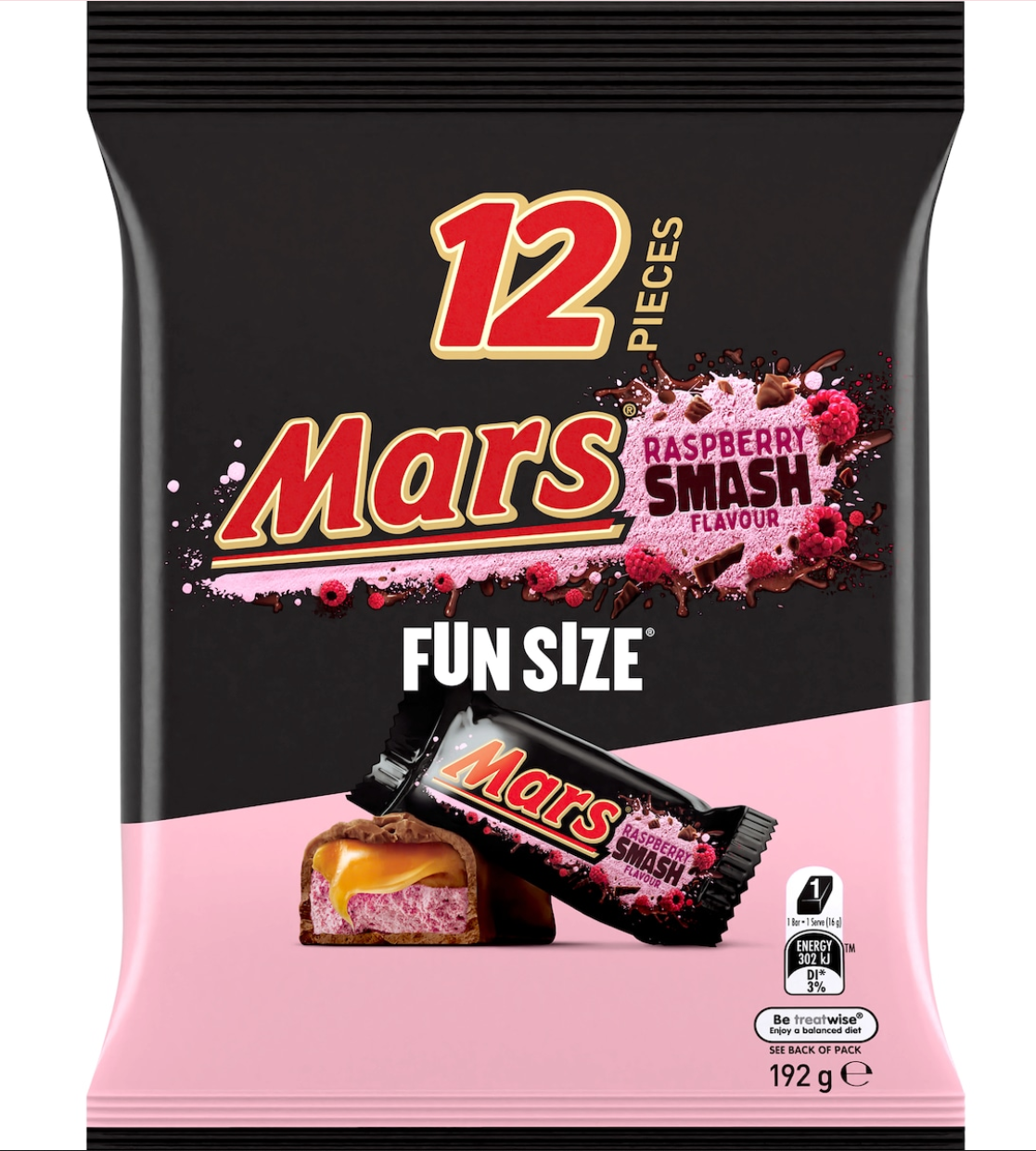 Not too big. Not too small. These crowd pleasing, party loving MARS Raspberry Smash FUN SIZE chocolate bars in a share pack of 12 are perfect for treating yourself and others. They are great for stocking the pantry, Halloween trick or treat bowls, mess-free lunch treats, road trips and everything in-between. Grab one today and enjoy delicious raspberry flavoured soft nougat, layered with MARS creamy caramel and coated with smooth milk chocolate. MARS - For You Who Did That Thing You Did!