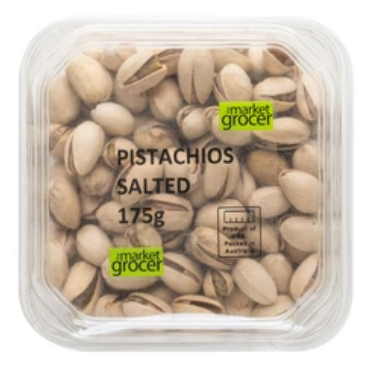 Enjoy the irresistible crunch and rich flavor of The Market Grocer Salted Pistachios. Packed with nutrients and antioxidants, these premium pistachios are the perfect guilt-free snack for any time of the day. Indulge in a healthy and delicious treat with every handful of our 175g pack.